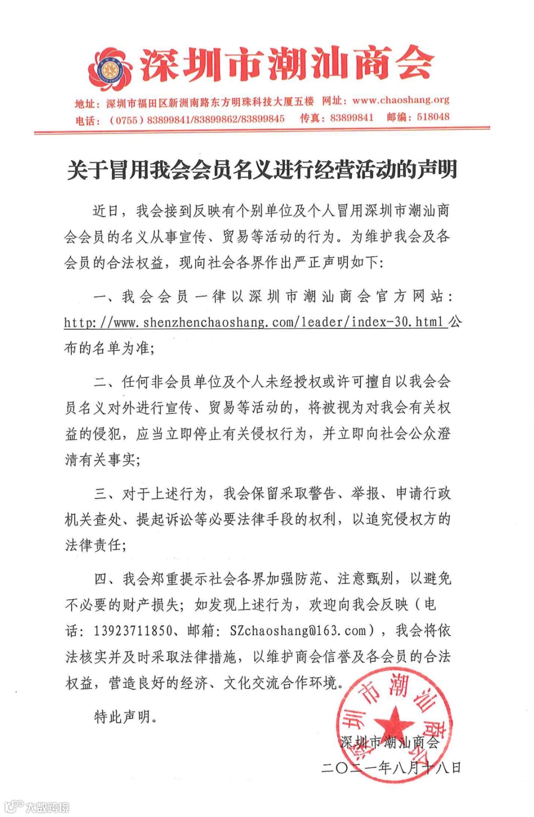 近日,我会接到反映有个别单位及个人冒用深圳市潮汕商会会员的名义从事宣传、贸易等活动的行为。为维护我会及各会员的合法权益,现向社会各界作出严正声明。