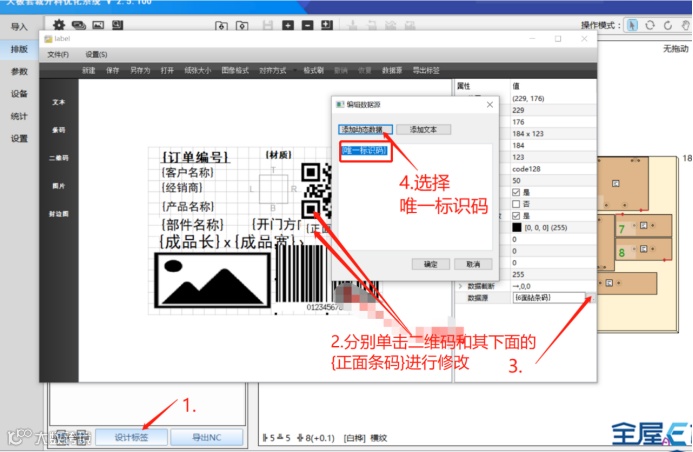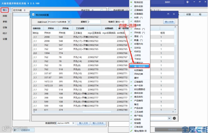 3.导入【optimization.zip】里面的料单,在【dxf条码】列上方右键-选择[唯一标识码],确认转换。