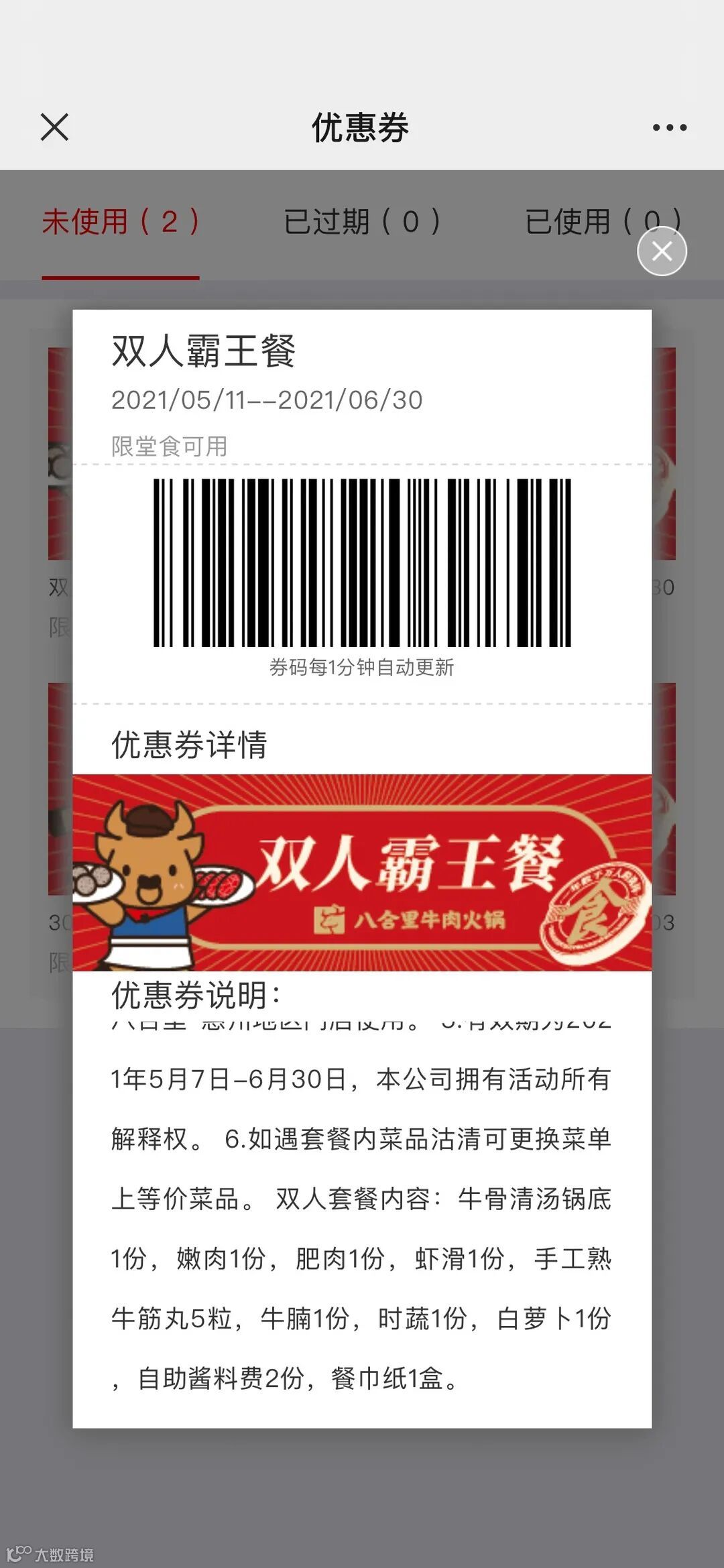 温馨提示:双人霸王餐数量有限,且是电子券形式,需通过八合里牛肉火锅的公众号领取。