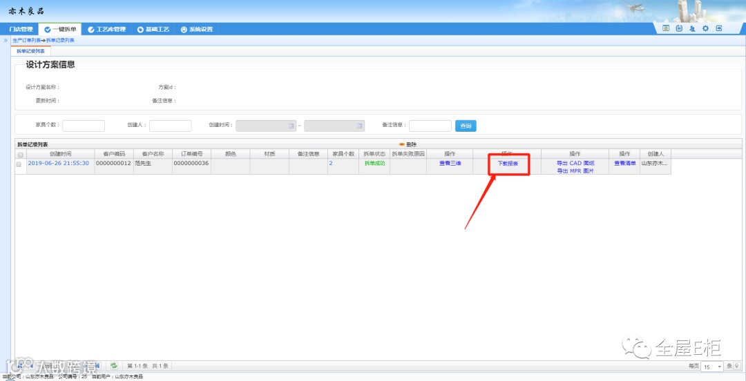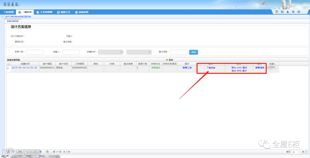 1)确认后,返回到订单信息列表,点击对应方案下的“一键拆单”