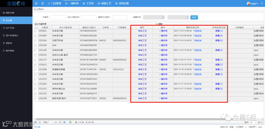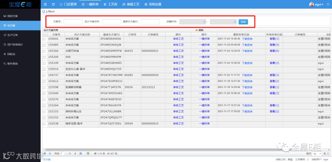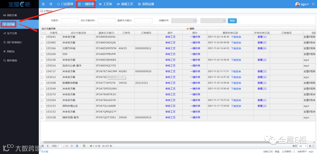 总方案,为所有设计方案的汇总,同时结合方案号、订单号、订单编号等信息,可以更准确地查看管理方案