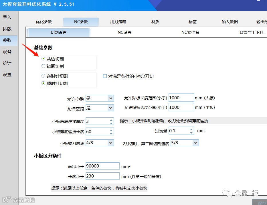 2.如果共边切割的话,这就是共边切割,能走一刀就不走两刀,相邻两块板一块是逆时针那另一块就是顺时针,统一的方向设置,不可能厚板逆时针,薄板顺时针。除了共边切割,两块板相邻的一条边,一块板是逆时针,那相对另一块板就是顺时针,根据你自己的需求选择薄板是否共边切割,共边切割时两块板之间只走一刀(以减少加工路径,提升效率),与刀具运动反方向的边就会容易出现毛刺,如果不需要就取消勾选共边切割;