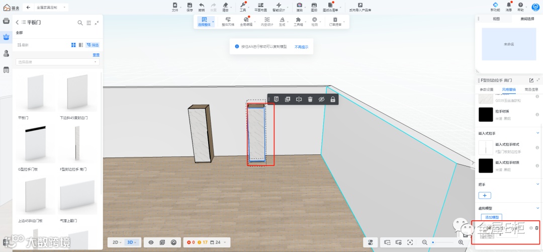 铰链套件是在参数化后台添加的,铰链在套件下层,前端不能直接更改虚拟件,而是通过参数控制