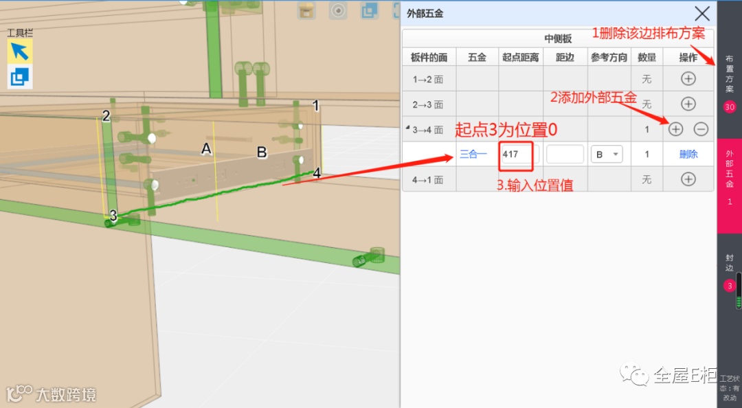 1、这里可以删除该边布置方案,添加两个外部五金(三合一),调整五金位置值(如下图)