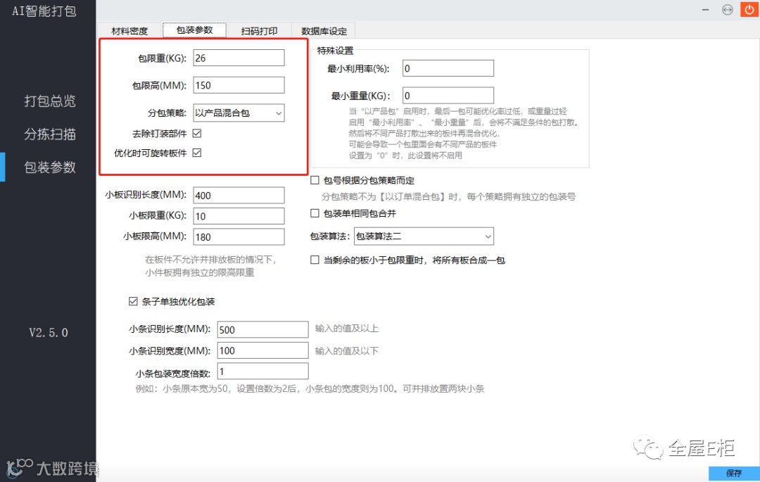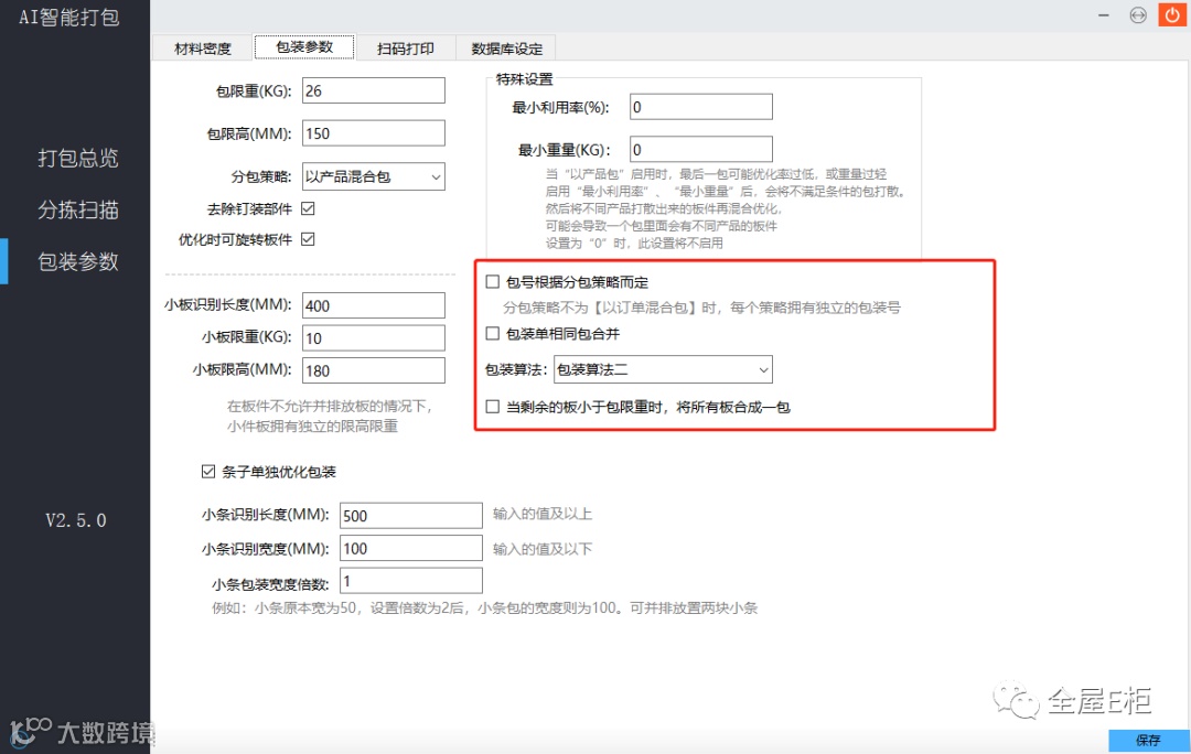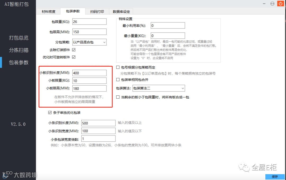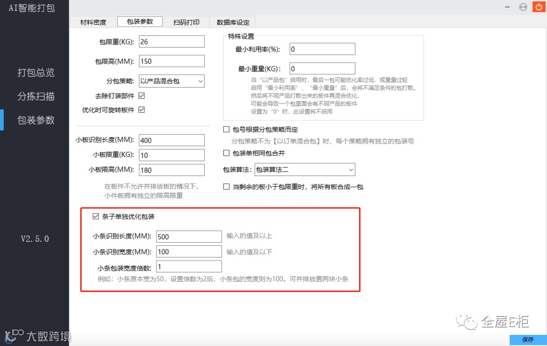 4、 小条包装宽度倍数:当有板件中被识别出小条时,基础包装的宽度则为小条的宽度。当倍数值不为1时,小条包装基础宽度乘于此倍数。(例:需要打包的产品中含有多块50宽的小条,当【小条包装宽度倍数】为2时,则小条包的宽度为100,可以并排放置两块小条。数值为1时,不允许并排放置。)