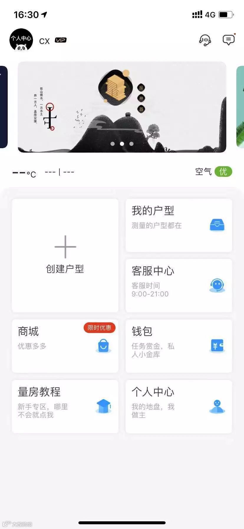 APP首页主要由创建户型,我的户型,商场,量房教程,客服中心,个人中心,钱包等七大模块构成。
