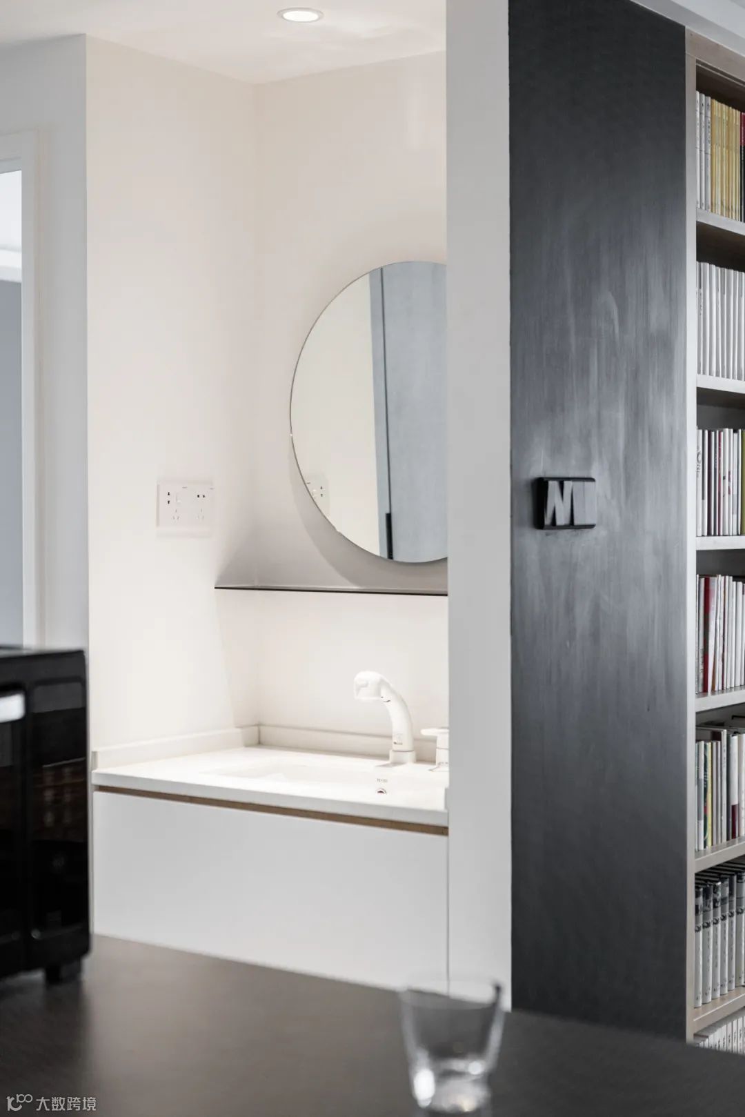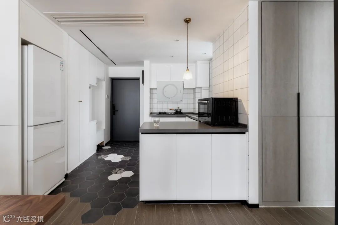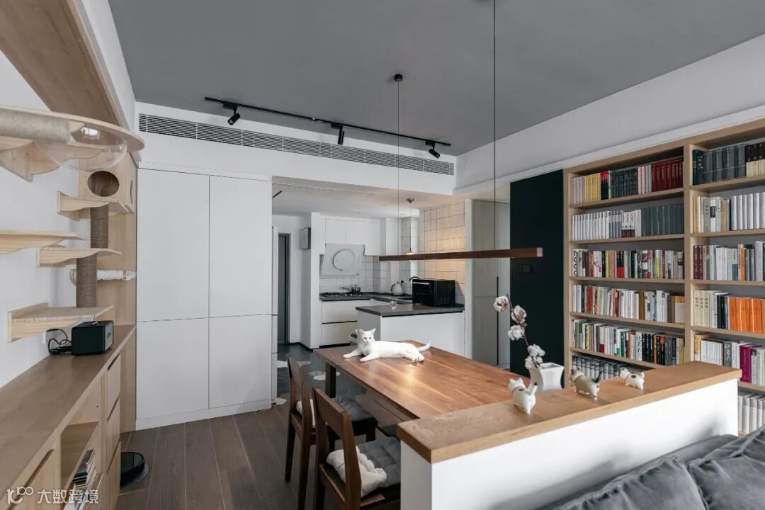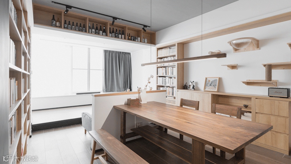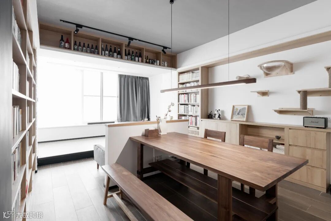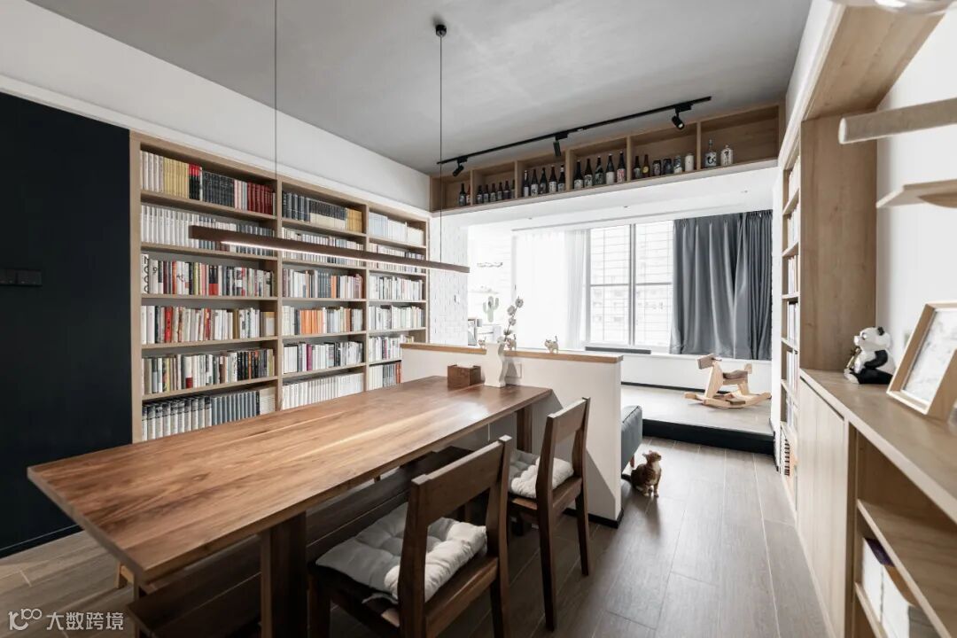 地面局部抬高,打造地台式阅读和休闲空间,随时可以坐下来看书小憩。侧面设置洗烘套装,满足衣物洗晒的需求。