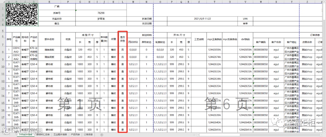 重新拆单后,输出的料单中就会自动区分门板开料清单及常规板、异形板。