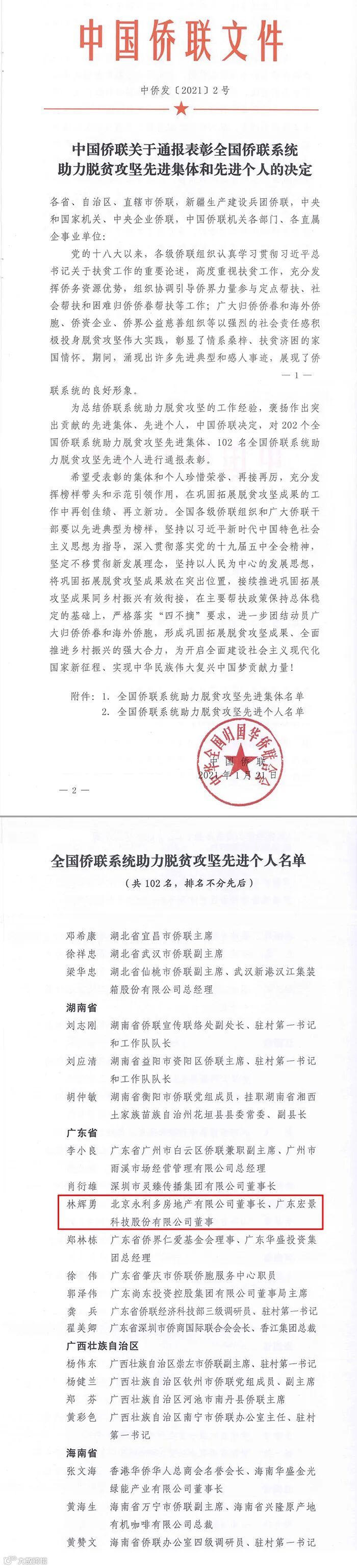 近日,根据《中国侨联关于通报表彰全国侨联系统助力脱贫攻坚先进集体和先进个人的决定》(中侨发〔2021〕2号),