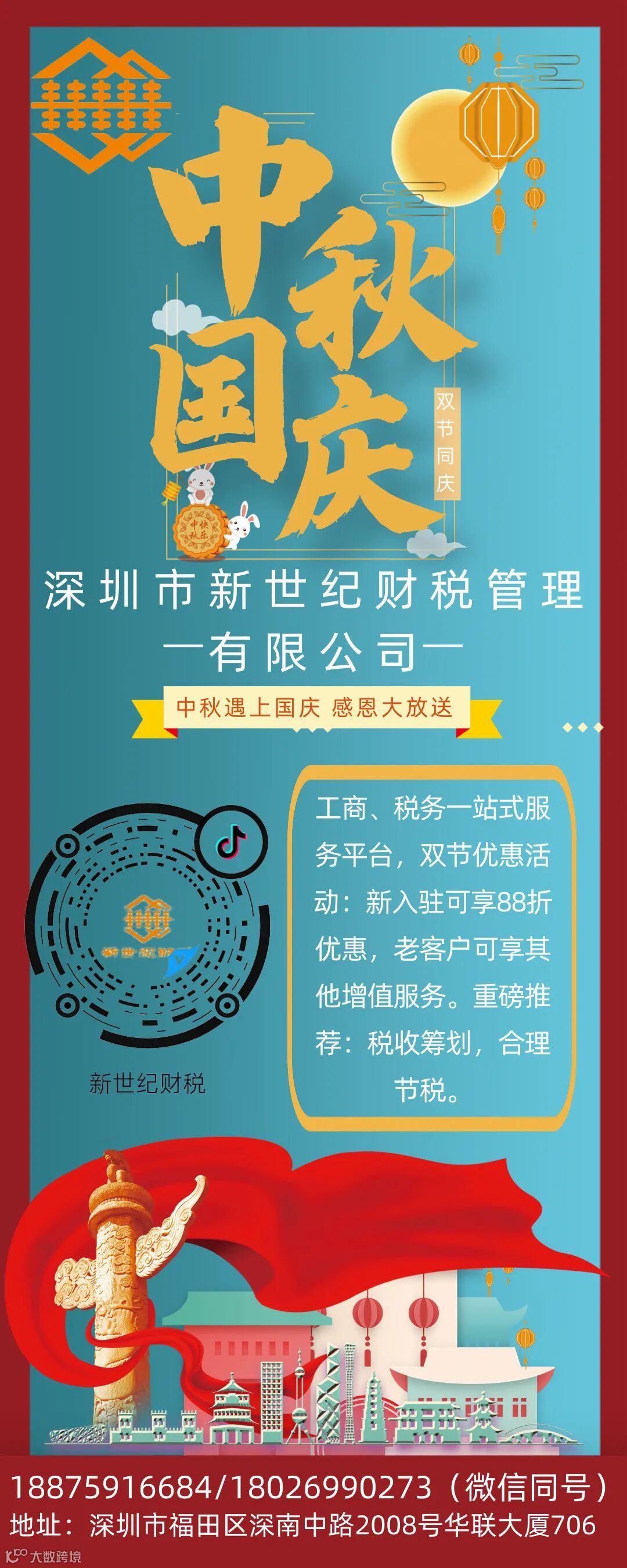 深圳市新世纪财税管理有限公司专注企业财税服务,致力于为企业提供专业、高效的工商、账务、税务一站式服务,主要有工商注册、工商变更、代理记账、纳税申报、银行开户、审计报告、公司注销、工商年检、税收筹划等,一站式服务,一心做好财税。双节钜惠,我司特推出优惠活动,具体详情见海报或联系我司咨询了解。