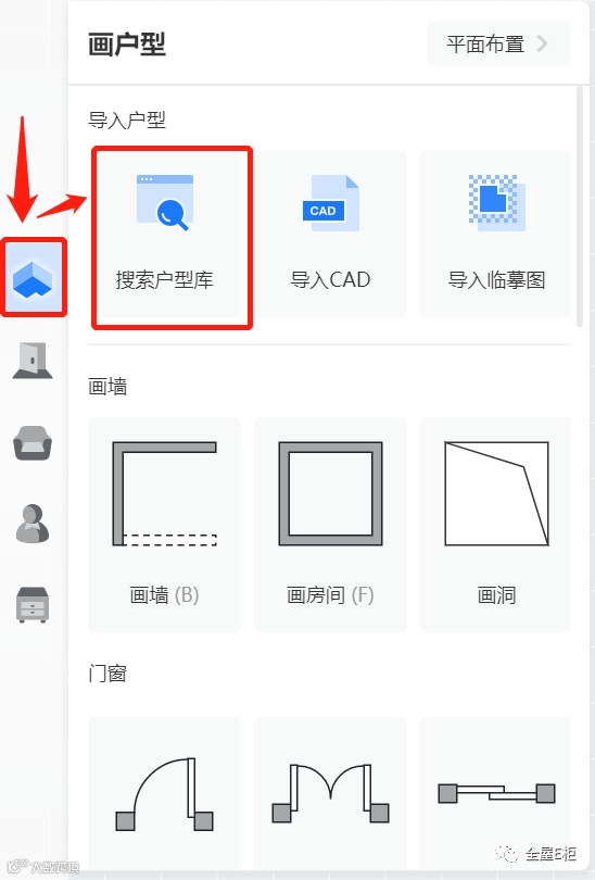 搜索户型库的入口—在页面左侧的画户型操作板块