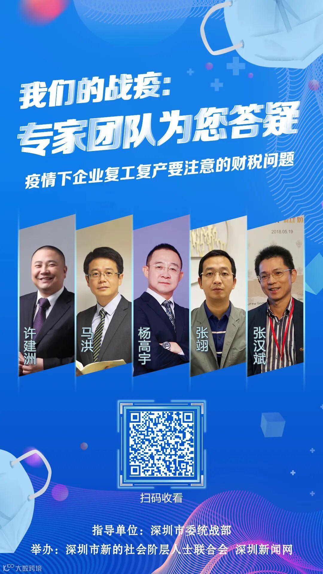 活动围绕民营中小微企业在疫情防控和复工复产中面临的“法”、“税”、“惠”等问题,由深圳市新阶层人士中优秀的律师、税务师、会计师组成专家团队实时在线答疑解惑,助力企业有序复工复产,增强企业共克时艰的信心和决心,为促进经济社会发展提供支持。(回看精彩内容请扫描下方二维码或点击左下角“阅读原文”)