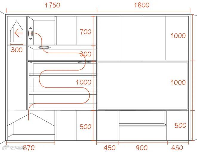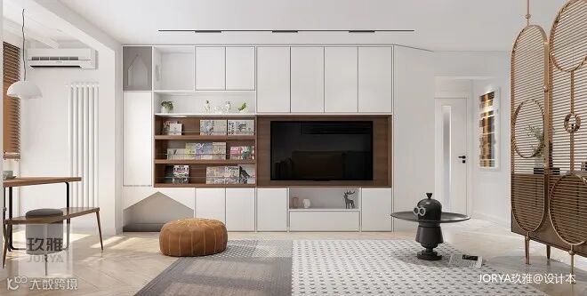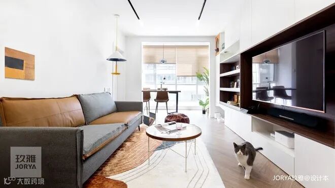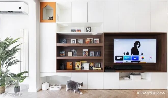 整体柜兼顾电视、储物、展示及猫爬架功能,两种颜色搭配,清爽不杂乱。