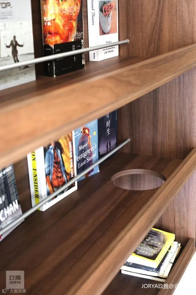 大门一开,原本一览无余的视野被定制的金属隔断揽在这一区域,增添了房间的神秘性。