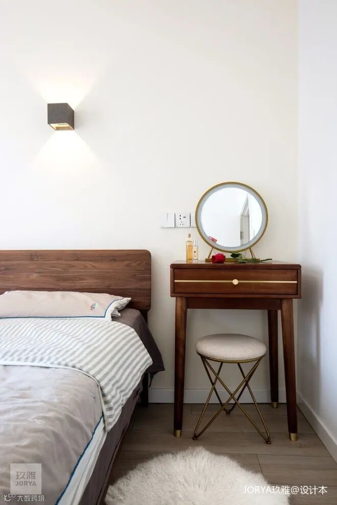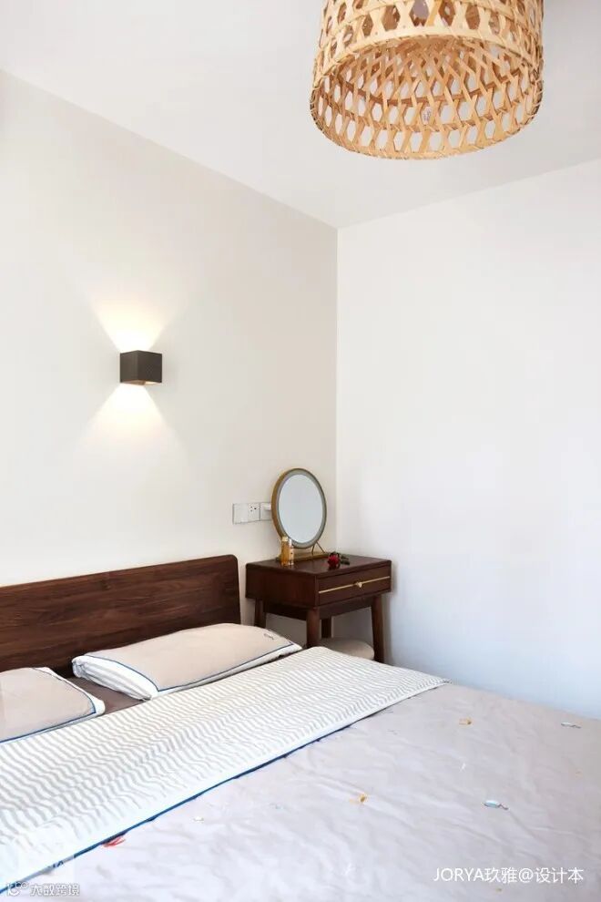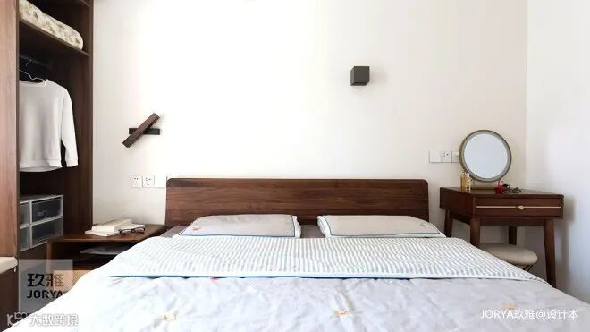 首先,将衣物存储分离出去,只保留一组68cm开放柜,用来放置平时换穿的家居服。省去了大容量的厚重衣柜,让卧室落得个干净清爽!