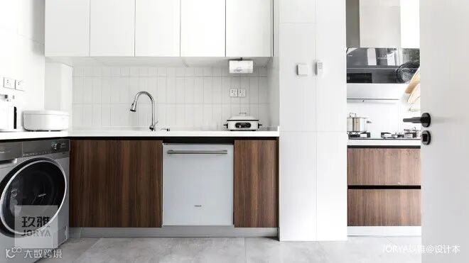 厨房紧随整屋风格,木色地柜奠定整体暖色调,白色吊柜尽显轻盈,墙面铺设300*600白色哑光砖,同系列100*300小规格作为操作台背景砖,精致有余,细节丰富。