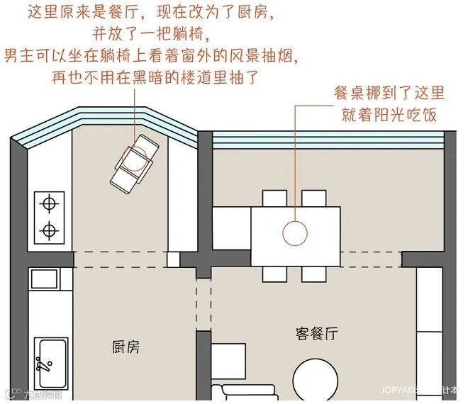 首先,进门一览无余,没有门厅。其次,原始餐厅在厨房的南侧,狭小逼仄,也没有空调,非常闷热。