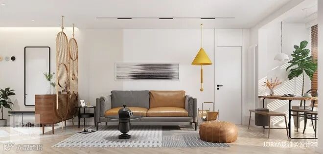 背景墙乳胶漆分色处理。夸张的吊灯平衡空间。黄棕色香格里拉窗帘笼罩日光,避免刺眼。