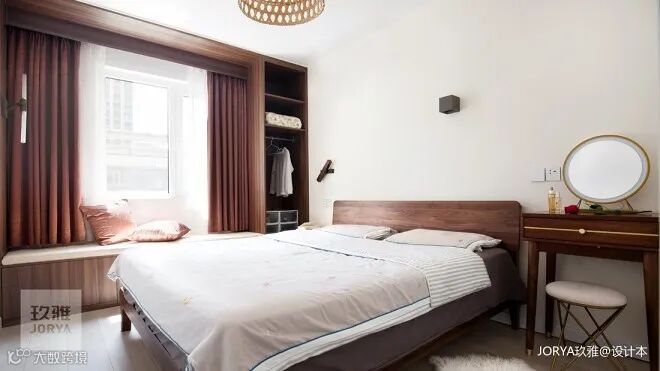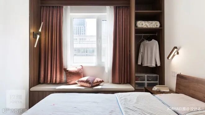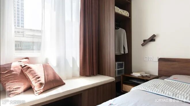 正面角度感受飘窗台的美好。开放高柜并入休闲区,挂放贴身家居服。座位下抽屉满足卧室储物需求。