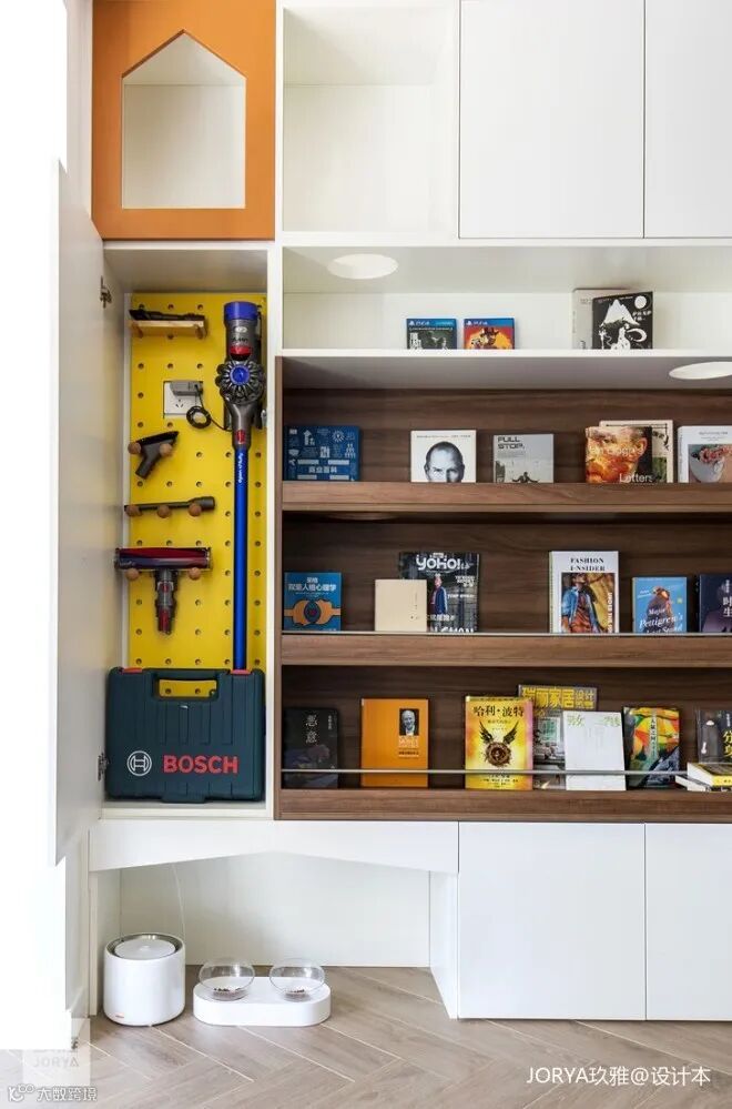 高柜用于工具的收纳,切记前期预留电源。洞洞板由理工男业主自己安装,为他的动手能力打call。对啦,戴森吸尘器乃是消灭猫毛第一利器。