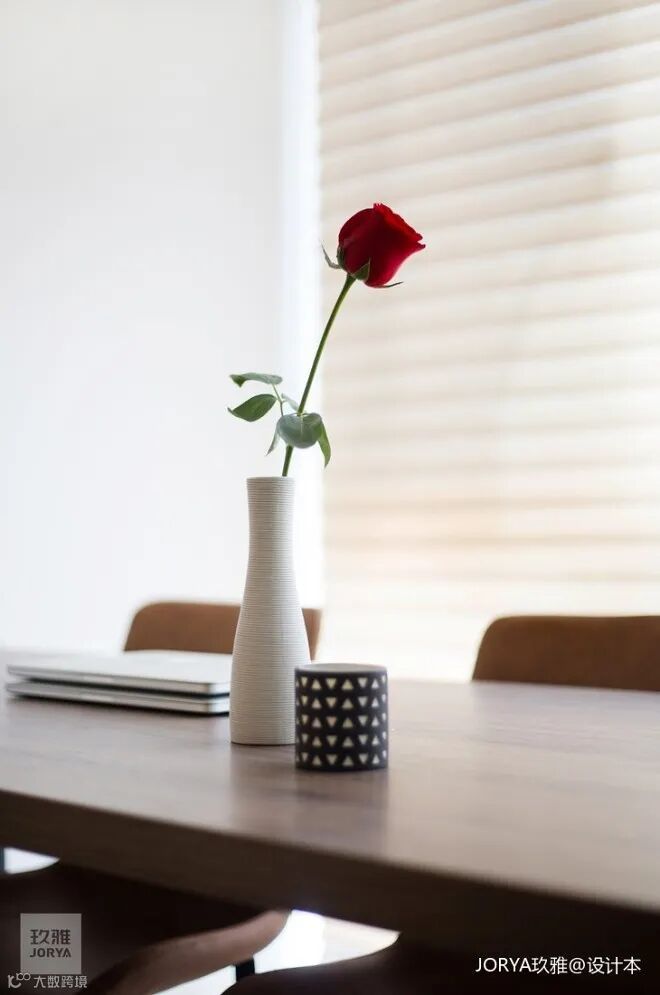 几何纹样蜡烛杯、白色纹理素花瓶、插上一枝热情的红玫瑰,足以装点空间。