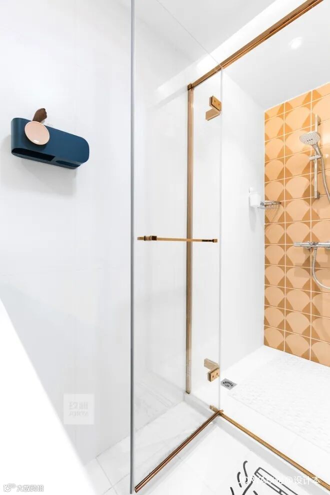 玫瑰金边框淋浴房与花砖颜色相得益彰,利用原始层高和吊顶的高度差,加入灯带,柔和的光源均匀的照亮整个卫生间。