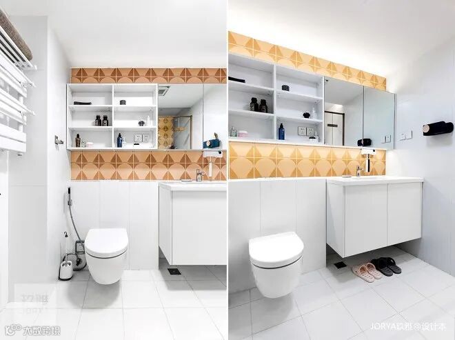 卫生间白色为主,空间宽裕整洁,趣味暖色小花砖点缀其中。封闭镜柜减少凌乱,开放架方便拿取物品,放置香氛。
