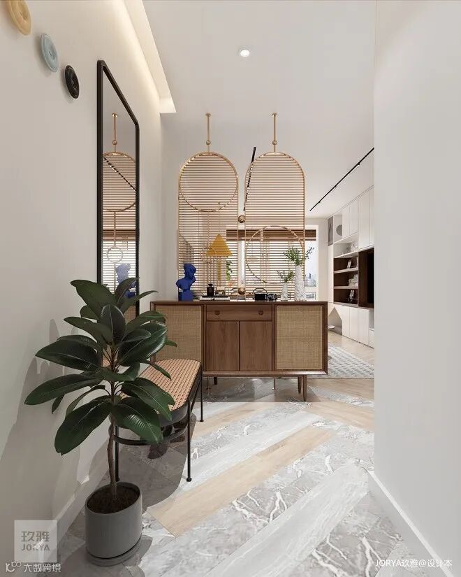 木质鞋柜采用了印尼拉菲草编柜门,带来自然气息。鞋柜抬高了20cm,用来放平时换穿的拖鞋,让空间更加透气。
