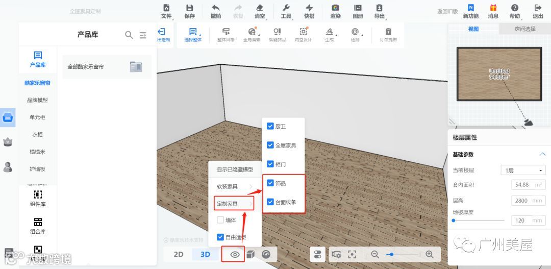 整体隐藏入口-增加”饰品“,”台面线条“;取消勾选后隐藏场景内定制的装饰程设,生成的台面线条。