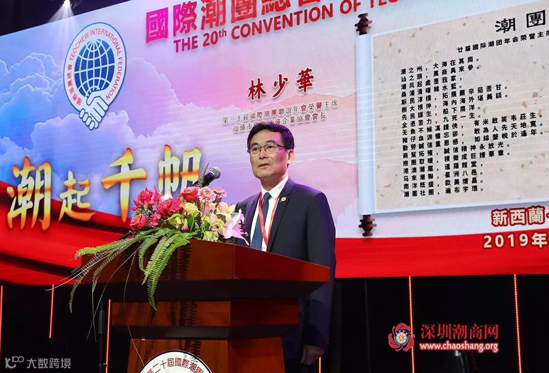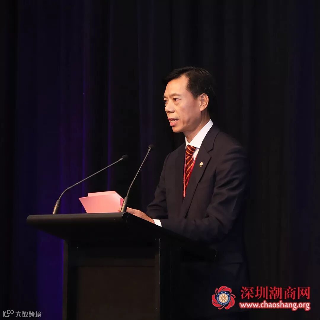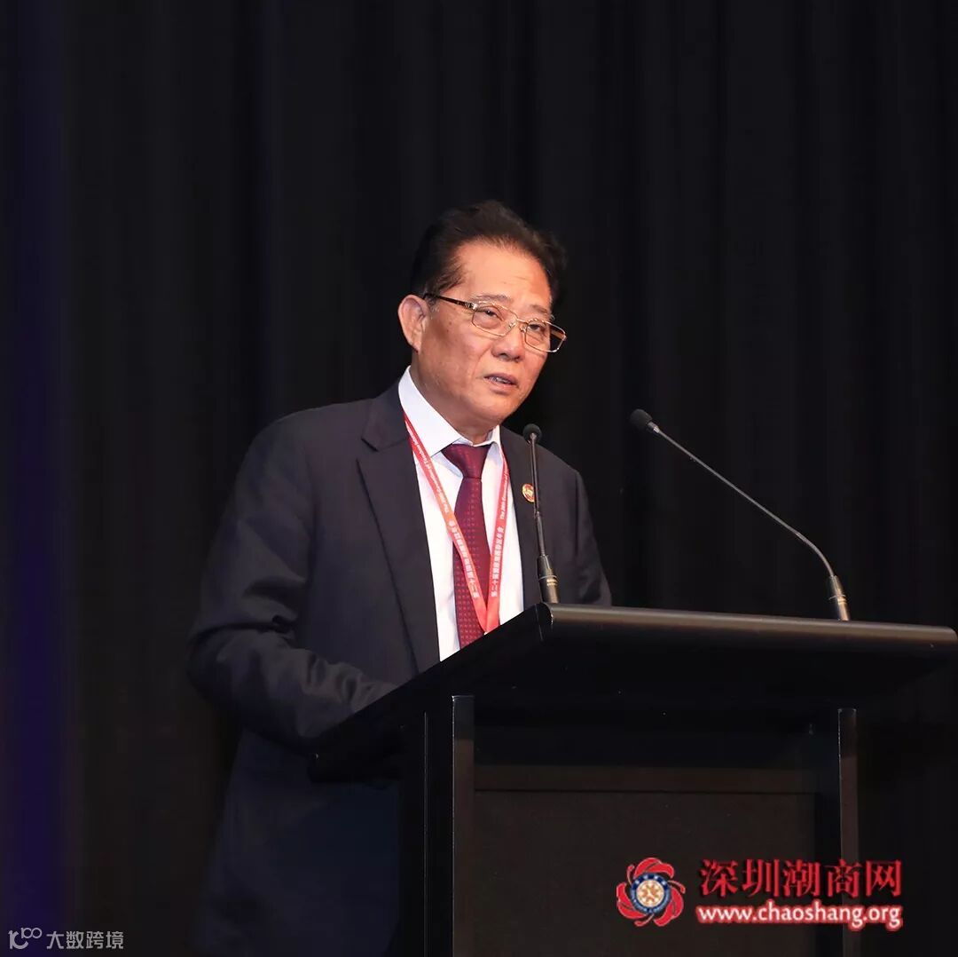 潮州政协主席杨志明致辞,代表家乡的潮汕乡亲为大会助阵加油,为身为千万潮汕儿女的一员而自豪。