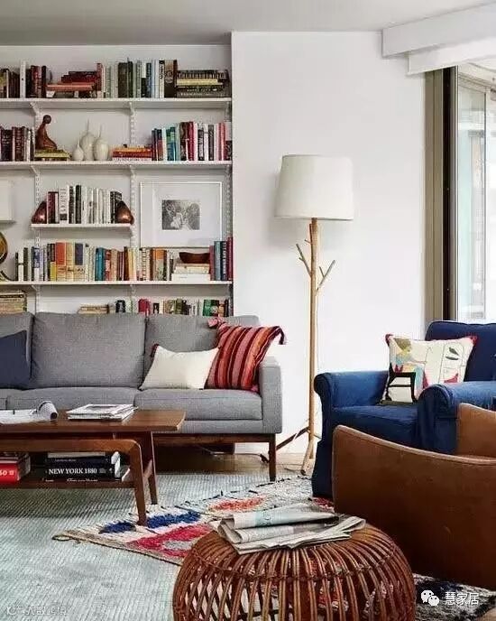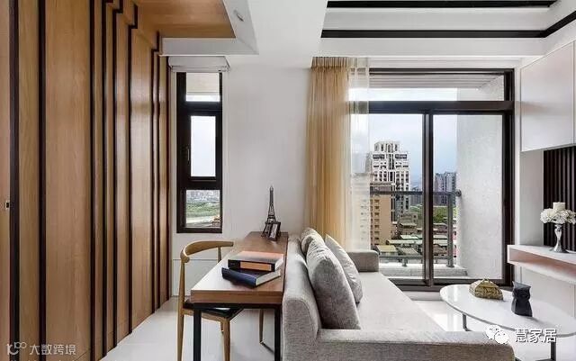 来一排半身高的小矮柜或顶天立地的柜子也不错,兼具收纳和展示架的功能。将书房和客厅合二为一,在视觉上客厅面积立马变大5㎡,户型小的家庭再适合不过了。