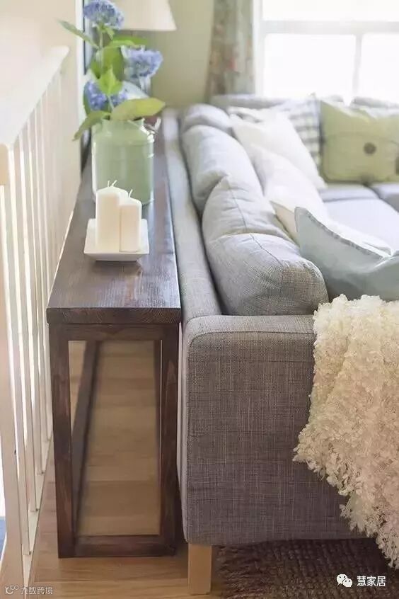 放一张小桌子,说的就是这样的桌子。细长的小桌子放在沙发后非常好看,沙发不贴着墙放也是对墙壁的一种保护,关键是小小的10cm,就能让家里的格调up!up!