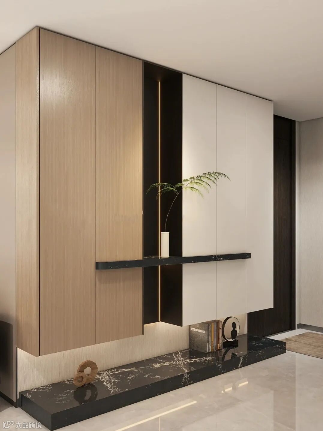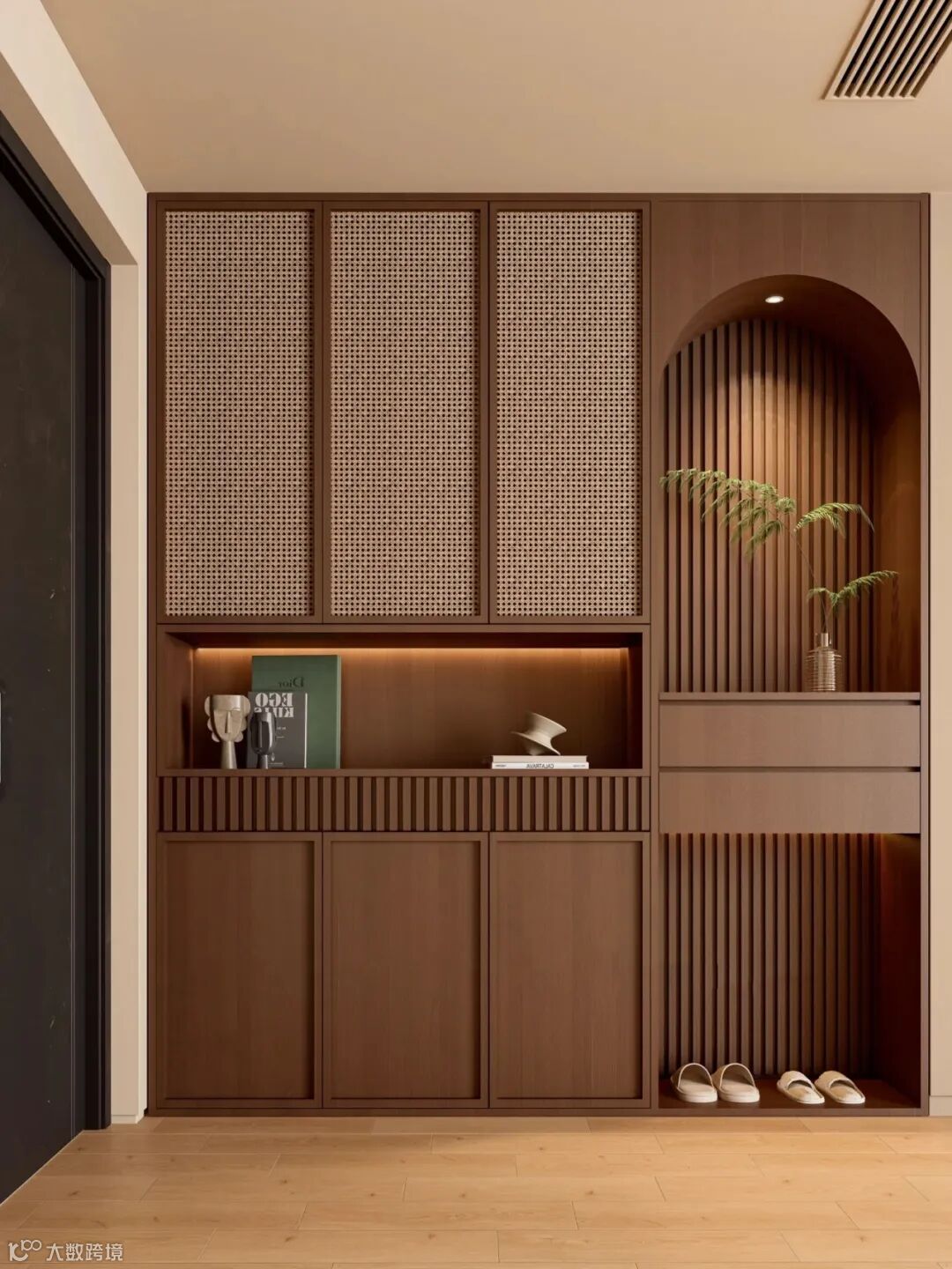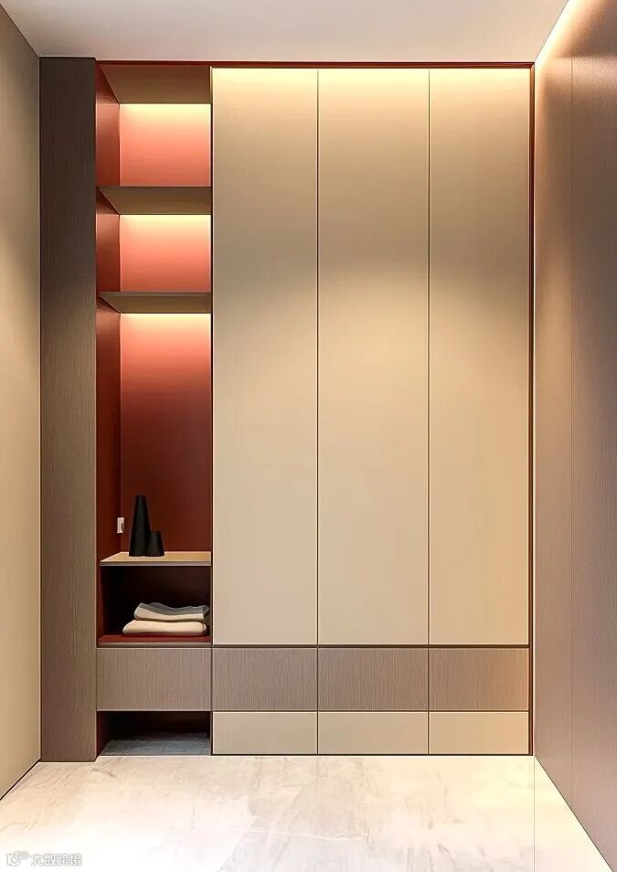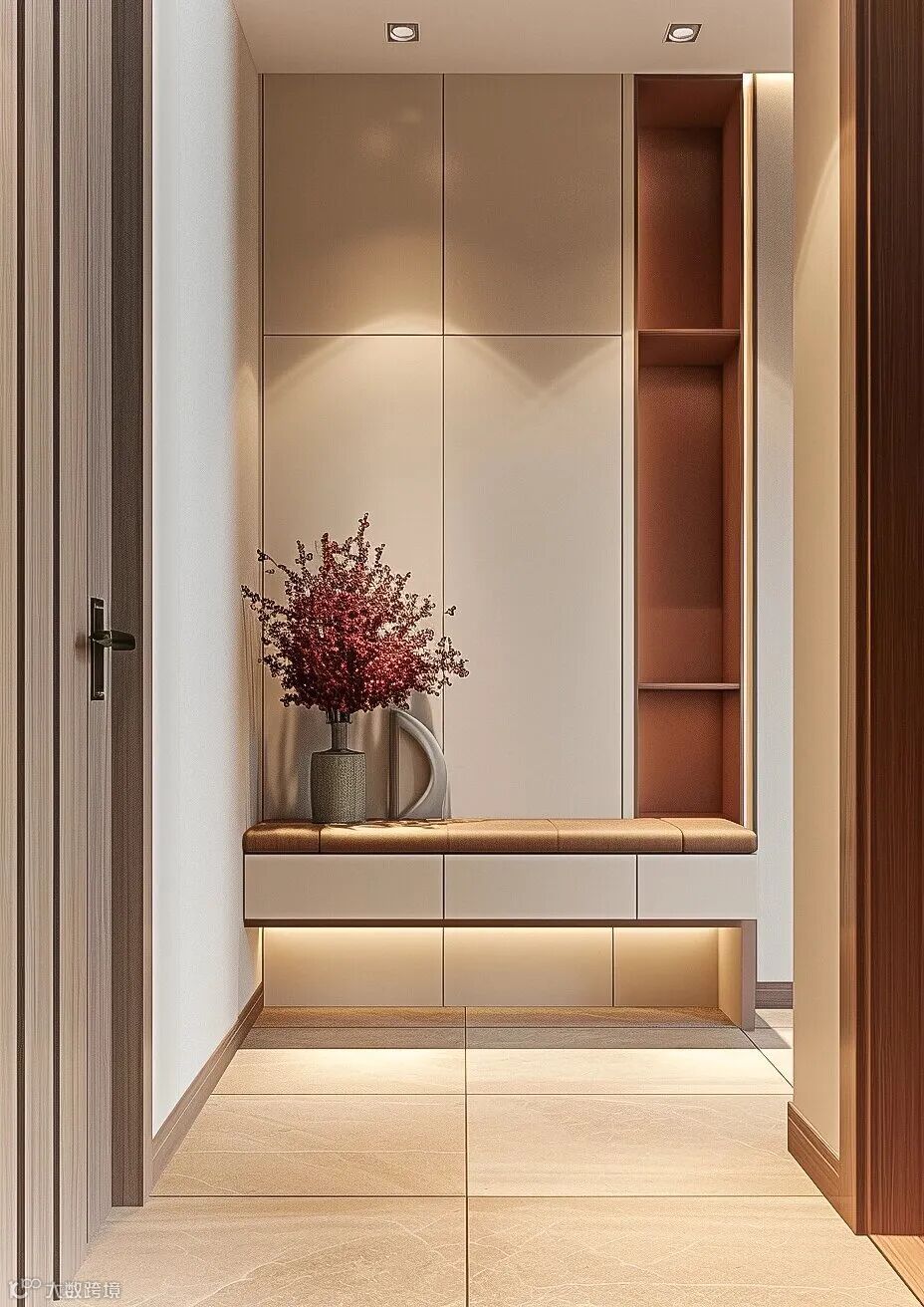 设计亮点:除了收纳鞋子,还可以集成换鞋凳、挂衣区、镜子等功能,方便实用。