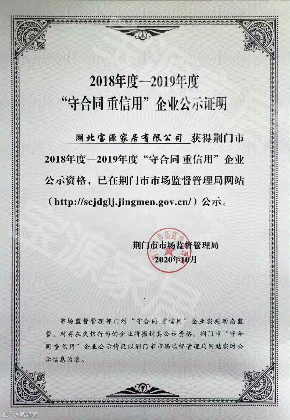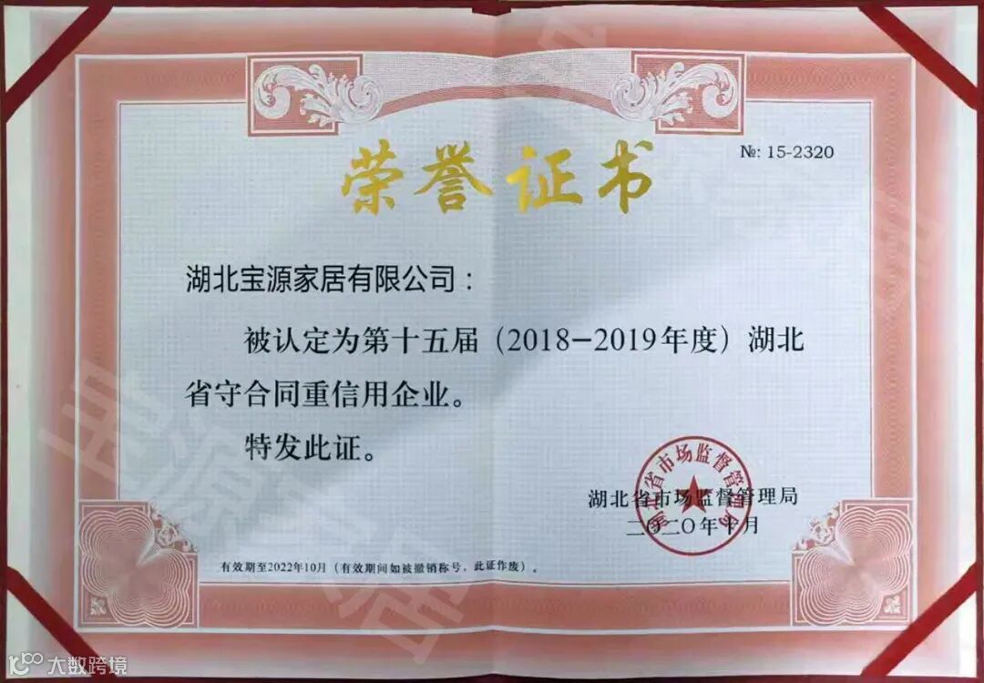 近日,湖北宝源家居有限公司凭借十七年来的积累与信誉,荣获第十五届(2018—2019年度)湖北省“守合同 重信用”企业称号。