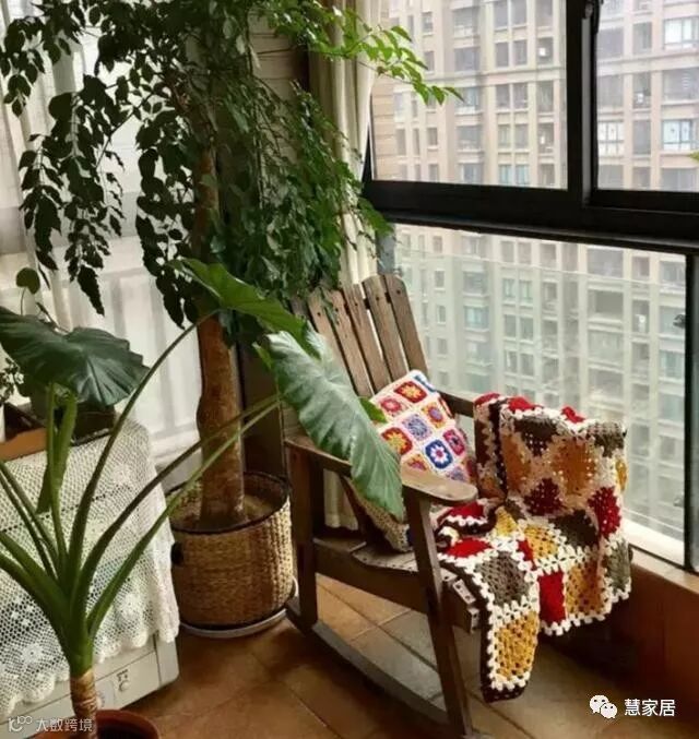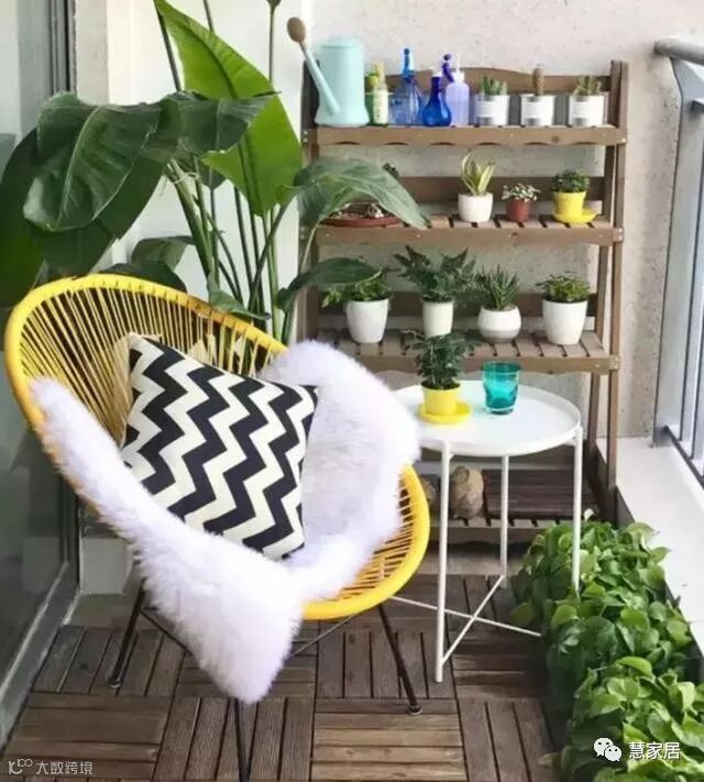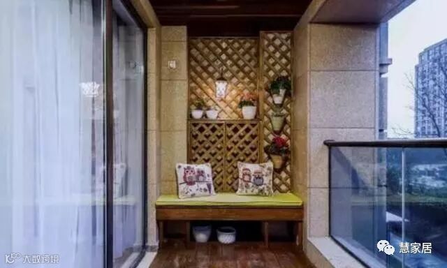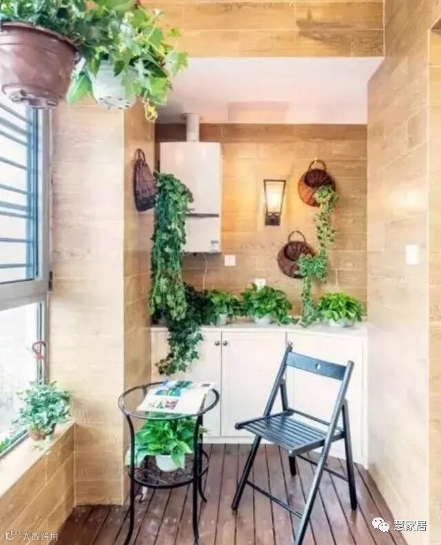 仔细看看,其实也没占多大地啊,就是在阳台两边设计小座椅和摆放些绿植。桑拿板做的吊顶,再装上防腐木的网格置物架,挂上些小花盆什么的,又简单又好看。
