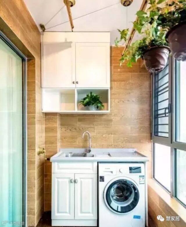 像这种一端放洗衣机,一端放个小茶几,一把休闲椅,顶上还可以做升降晾衣架。