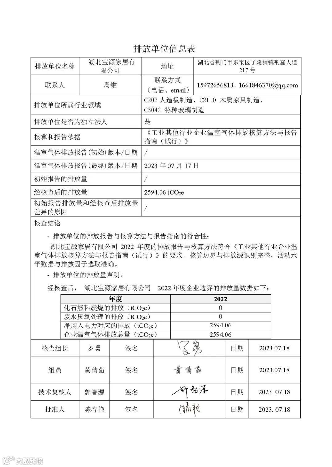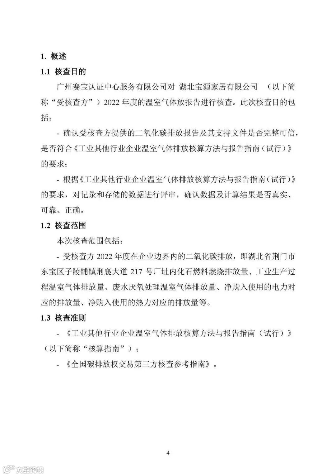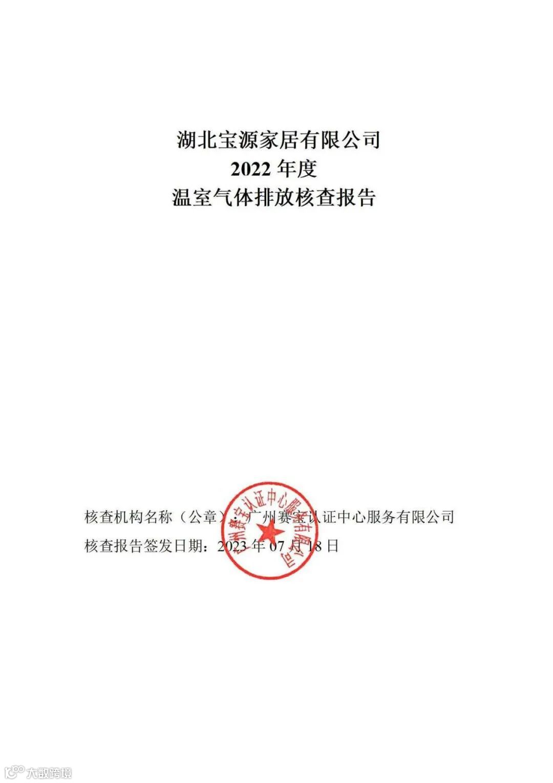 2023年7月广州赛宝认证中心服务有限公司受邀对湖北宝源家居有限公司 (以下简称“受核查方”) 2022 年度的温室气体放报告进行核查。