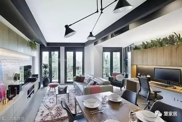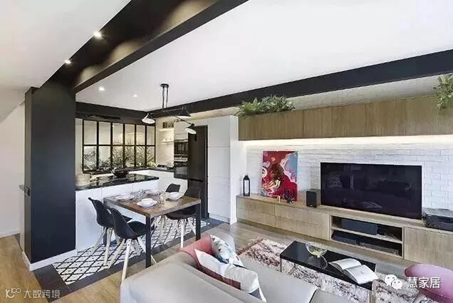 白色为基底,黑色粗线条搭配,简约中透露着工业魅力的粗犷,同时使用了大量的木元素,极高的包容度让室内即便物品丰富,也不显杂乱。