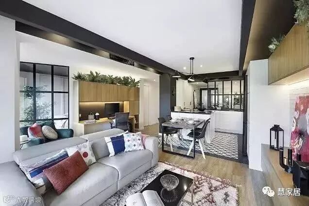 以黑色钢架安放在原先墙体的位置,轻松感受到功能区的划分,窗外的阳光、绿植透过窗户穿透进室内。