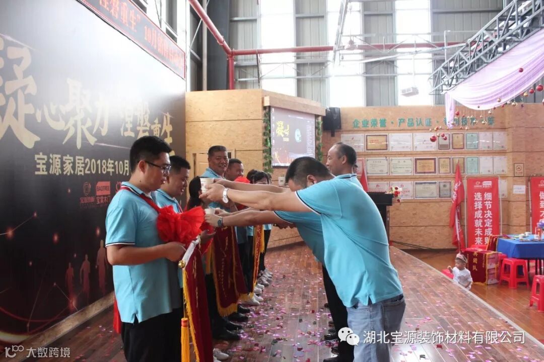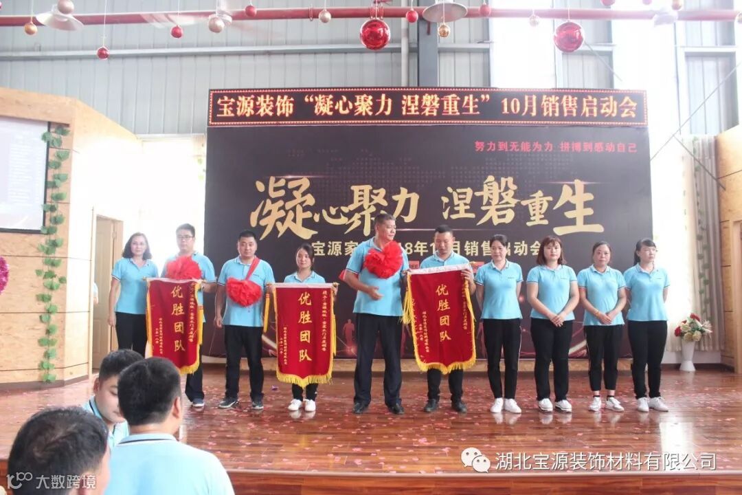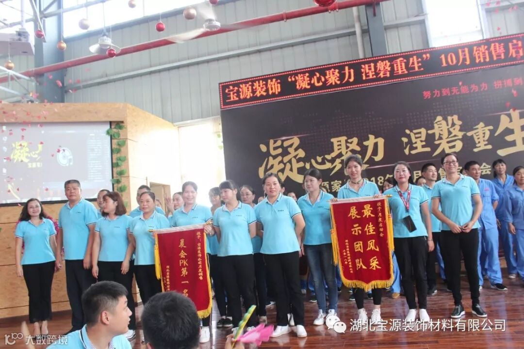 会议的开场,销售团队、直营团队、机关团队、木门团队、油漆团队、地板团队、玻璃团队、指接团队分别进行了团队创意展示。每个团队都激情澎湃、热情洋溢、充满自信,展示出了团队的力量和宝源人的风采。经过评委的打分直营团队和机关团队获得了第一名,指接团队和木门团队分别获得了二、三名。公司副总陈金凤女士为他们颁发了团队荣誉锦旗。