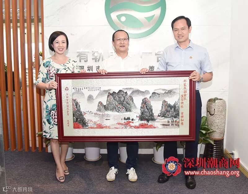 走访团代表商会向郑家庆副会长(中)送上一幅潮绣珍品作为生日贺礼