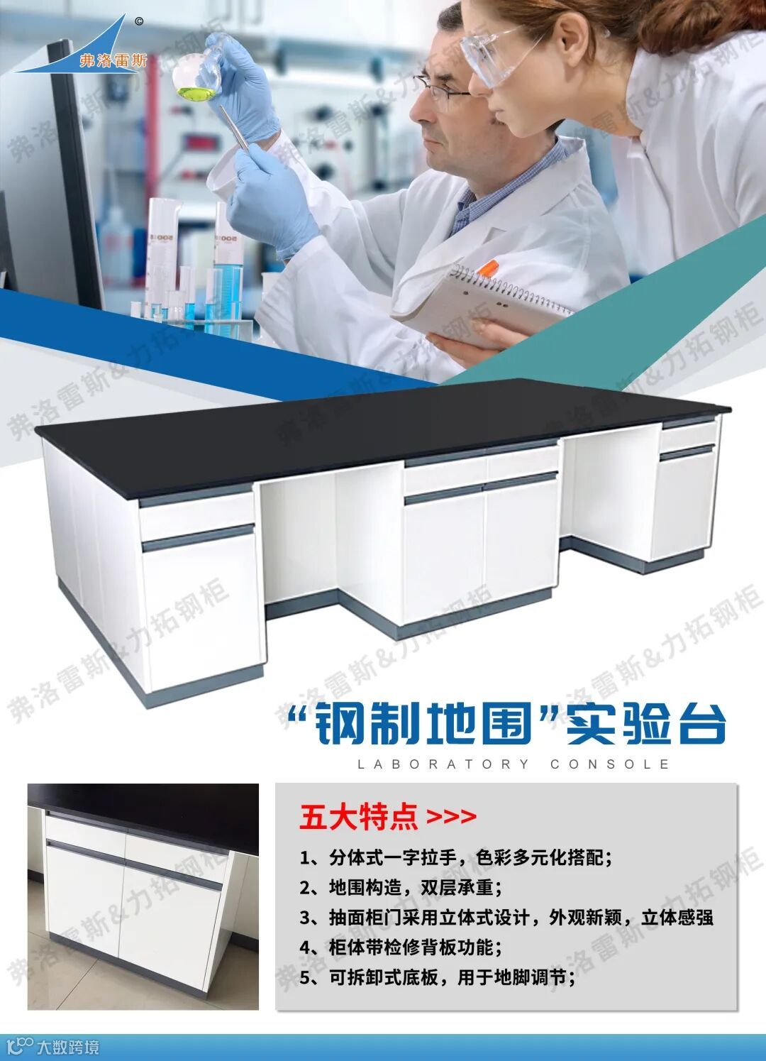 主要特点是踢脚线处采用地围设计构造制作,和柜体形成双层承重,增加承重及实验台整体稳定性;