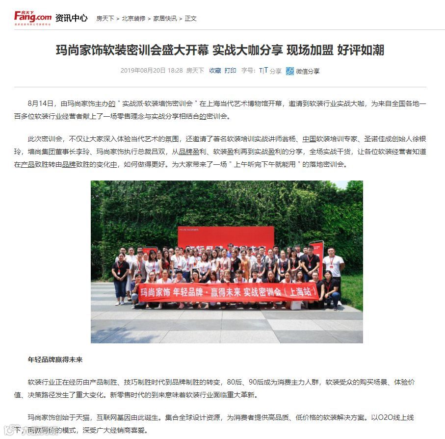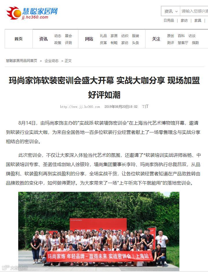 “年轻品牌·创造未来”——玛尚"实战派·墙饰软装密训会(上海站)"自8月14日召开后,通过玛尚家饰品牌总部自主运营平台及各大合作媒体的传播造势,热度持续飙升。