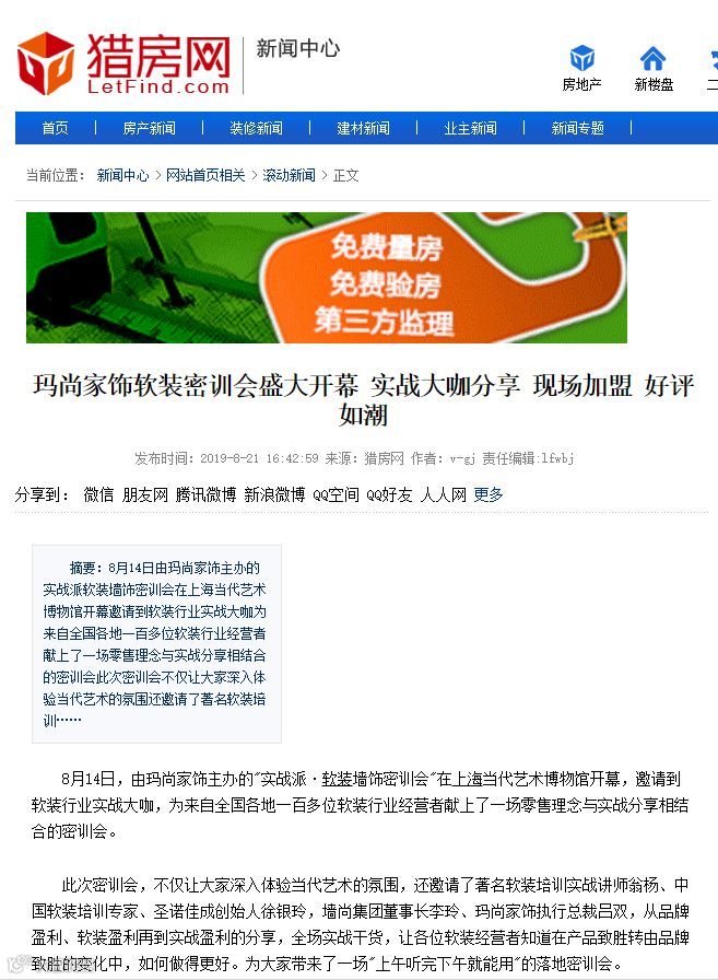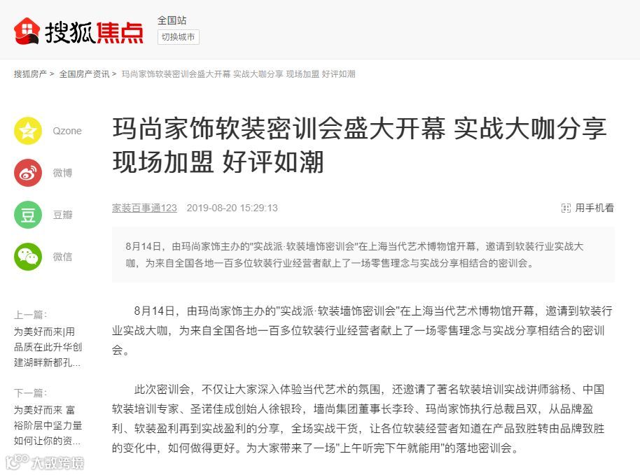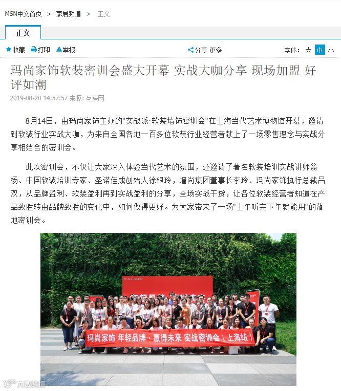 为了让更多的消费者领略玛尚家饰品牌的风采,我们特别联络腾讯家居、凤凰居悦、搜狐焦点家居、MSN家居频道、猎房网等近30多家主流媒体报道本次品牌密训会,快来看他们为玛尚定制的宣传盛况!