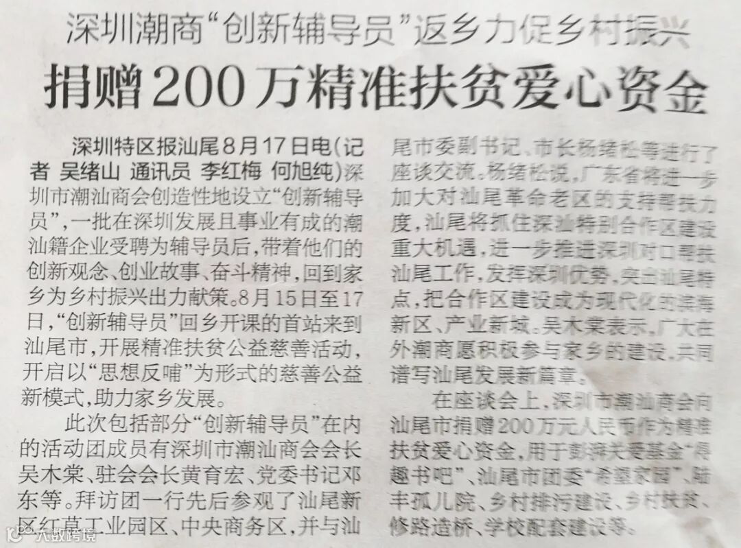深圳市潮汕商会创造性地设立“创新辅导员”, 一批在深圳发展且事业有成的潮汕籍企业受聘为辅导员后,带着他们的创新观念、创业故事、奋斗精神,回到家乡为乡村振兴出力献策。