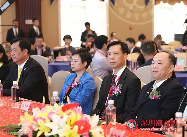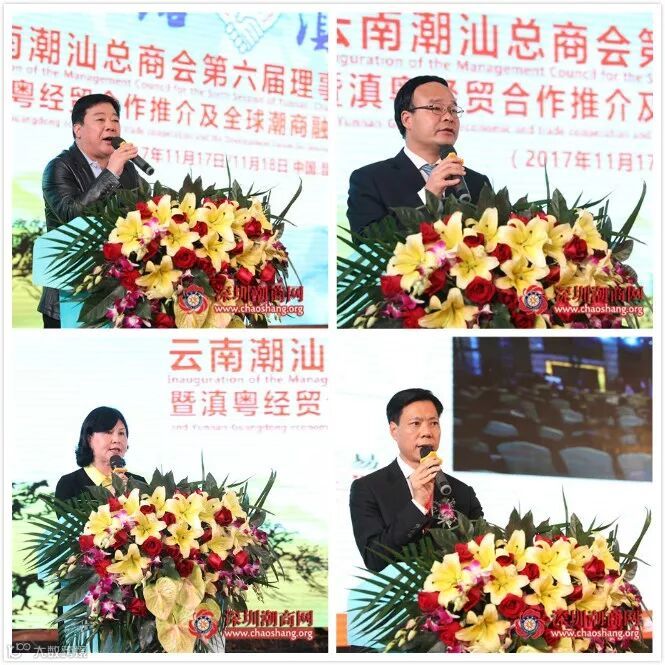 从上至下,从左至右分别是: 广东省人民政府驻昆明办主任刘金发、云南招商合作局副局长阮凤斌、 汕头市政协副主席蔡佩侬、深圳市潮汕商会会长吴木棠