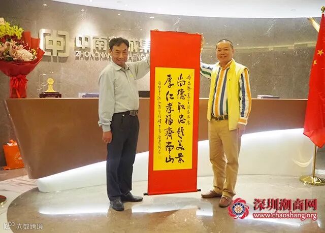 感谢蔡忠南副会长一直以来对商会的支持和奉献,今天是蔡会长的生日,商会秘书处特此送上商会会旗、纪念品、生日书法对联、生日鲜花祝福。书法对联内容是:“尚德耿忠题美景,厚仁孝福齐南山”。