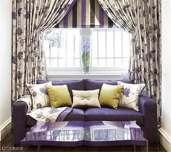 这组黄色、紫色以及奶白色的窗帘布和沙发颜色的搭配,让人叫绝。假如你不想费心去找各种软装搭配,整体配套的装饰也能突出家装的品位。