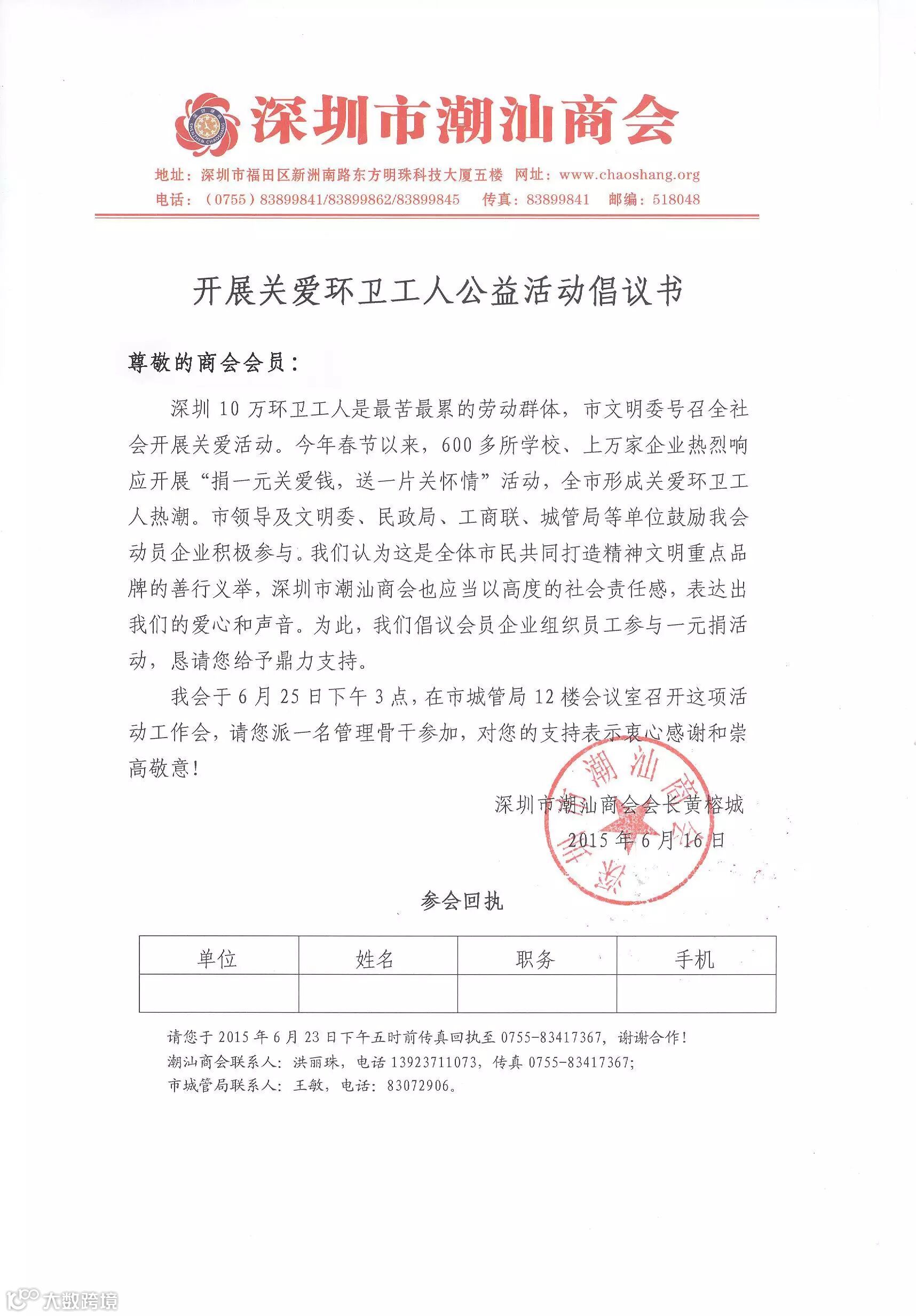 【深圳市潮汕商会】关爱环卫工人公益活动:商会倡议会员企业组织员工参与“捐一元关爱钱,送一片关怀情”活动,并请您或派代表参加6月25日下午三时在市城管局12楼会议室召开这项活动的工作会。恳请您给予鼎力支持。详情请电:洪小姐13923711073。