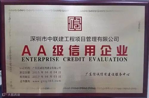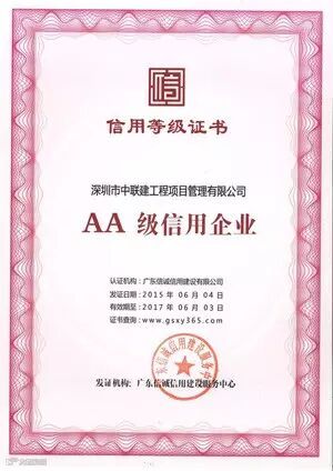 “AA” 级企业信用等级评价推动企业诚信自律,树立企业信用,创造良好的市场经济秩序。信用评级专家评审团对中联建公司进行多项指标评定,包括企业信用记录、企业经营管理、行业知名度及企业发展前景等。在经过信用评级专家团全面评审后,授予中联建公司“AA”级信用证书。